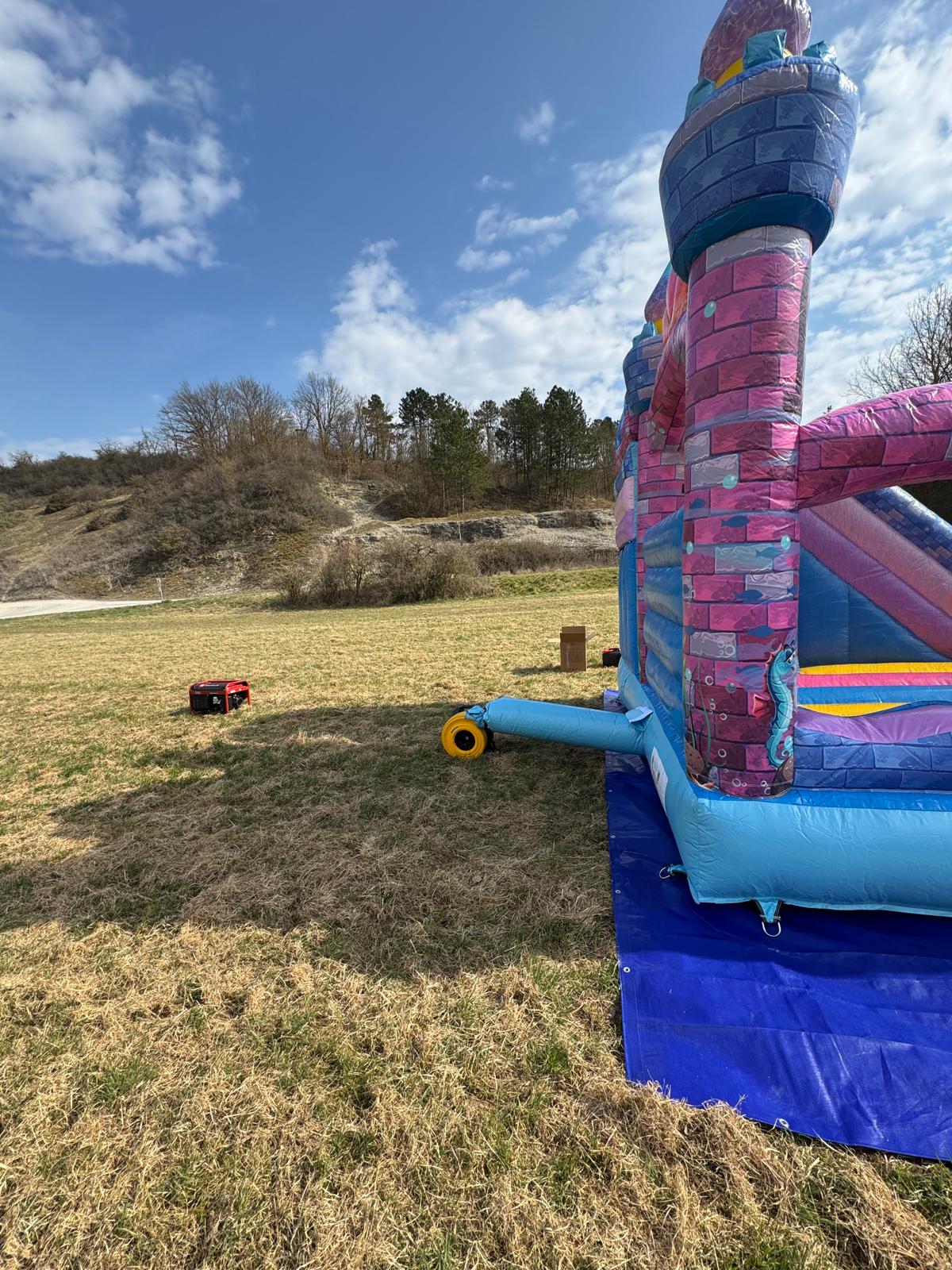 Die von uns zur Vermietung angebotene Hüpfburg wird mit einem Standardgebläse, Erdnägeln oder auf Betonboden mit Sandsäcken und Seilen befestigt.